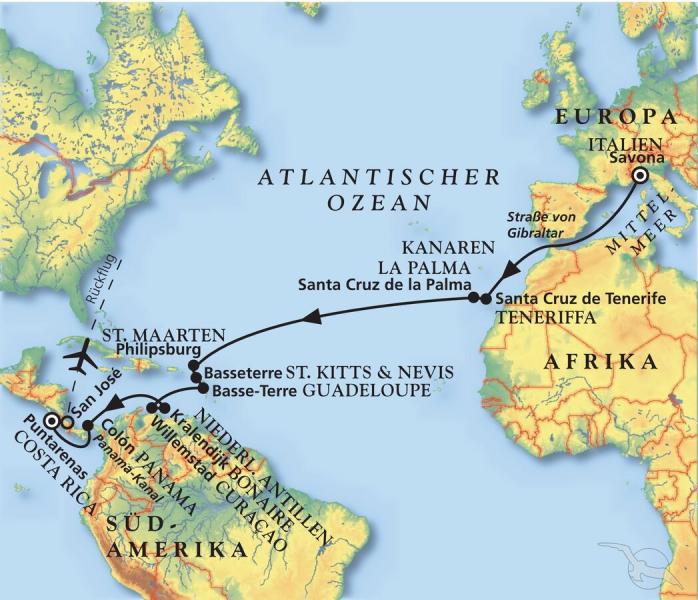 Kurz vor Weihnachten heißt es "Herzlich Willkommen an Bord" Ihrer MS Artania zu dieser Kreuzfahrt von Italien über die Kanaren und Karibik bis Costa Rica. Beziehen Sie Ihre Kabine und fühlen sich wohl, während MS Artania Kurs auf den Atlantik nimmt. An Bord verwöhnt man Sie mit hervorragendem Service und einer großen Auswahl kulinarischer und unterhaltsamer Genüsse. Und an Land entdecken Sie karibische Lebensfreude und die Schönheit der mittelamerikanischen Tropenwälder. Hier geht's zur besten Kabinezur Buchungsanfrage